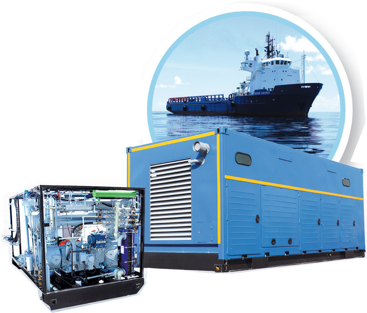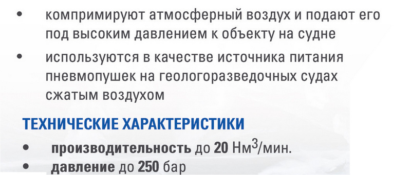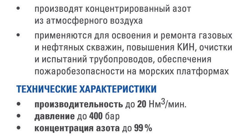 Кроме морских воздушных компрессорных установок, на шельфе востребованы генераторы азота высокого давления. Азотные компрессорные станции серии ТГА генерируют концентрированный азот из атмосферного воздуха непосредственно на морской арктической платформе. Широкий ряд моделей азотных станций позволяет выбрать показатели давления нагнетания до 400 бар, производительность до 20 Нм3/мин, концентрацию до 99 %.